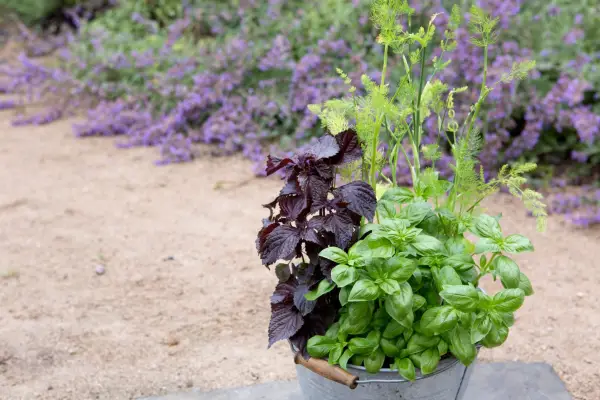 En skinnende metalstil container er ideel til dyrkning af urter til sommeroptagelser. I denne usædvanlige gryde har vi brugt en sommerens vigtige - basilikum - Med Firenze fennikel og Shiso, også kendt som Perilla.