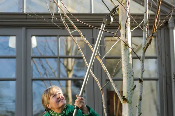 Lang-rækkevidde pruners are like secateurs on a long pole. They're operated by pulling a rope or lever at the other end. They're ideal for the occasional pruning of tall trees or big shrubs cutting woody branches up to about 3cm thick.