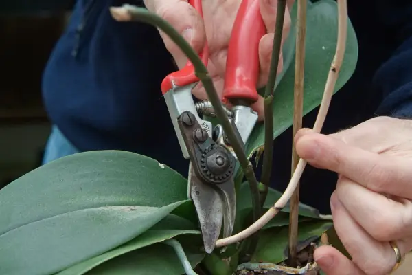 Fjernelse af en død orkidéblomsterstamme ved dens base