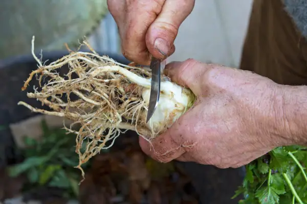 Hvordan man vokser celleriac - trimming roots from a celeriac bulb with a knife