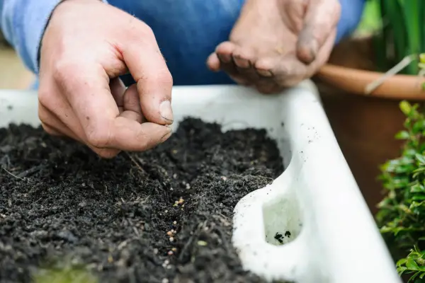 Såing radish seeds in a containers