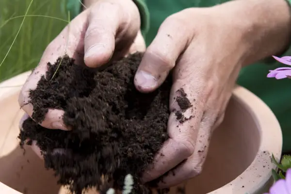 Tilsæt crocks til bunden af gryden for at hjælpe dræning, og fyld to tredjedele med kompost.