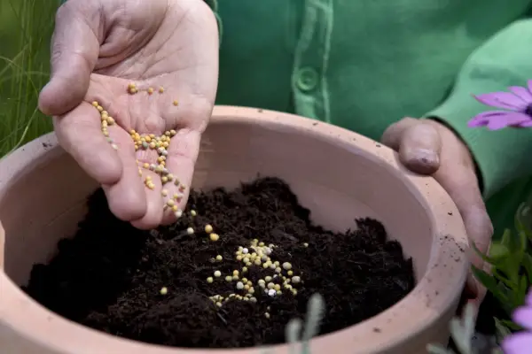 Tilsæt gødning med langsom frigivelse og vandaflydningsgel til komposten, og bland den ind med dine hænder.