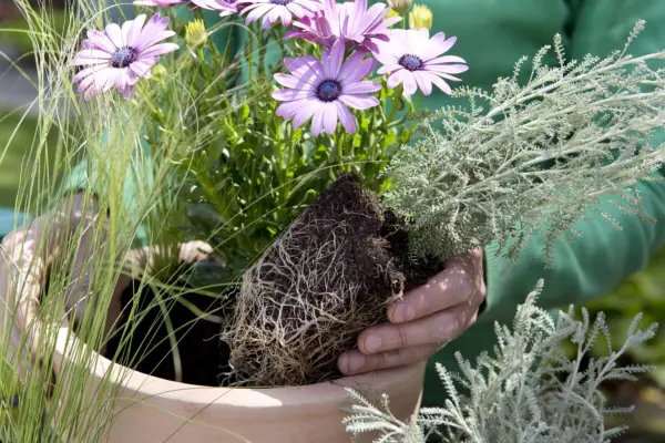 Tilføj først Stipa og Osteospermum, og sæt Santolina ind omkring de andre planter. Tilføj kompost for at udfylde hullerne og firmaet godt. Vand gryden grundigt og lad det dræne, før den flytter til sin endelige position.