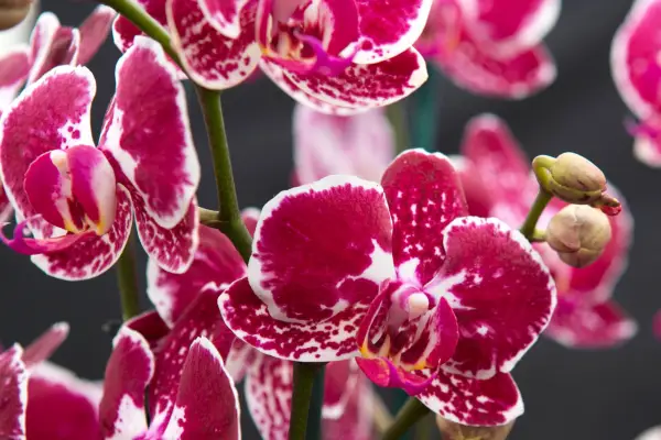 Phalaenopsis 'Ganlin Fairy' bærer kaskader af store, prangende lyserøde blomster med hvide stænk. For de bedste resultater vand frit, tåge hver dag for at tilskynde til fugtighed og fodre en gang om måneden fra forår til efterår. Stop med at vandes om vinteren og hold løvet tørt.