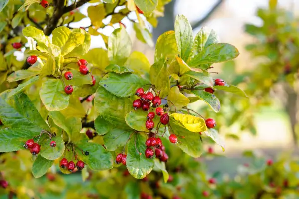 Photinia villosa is a deciduous shrub that can grow into a small tree with a bushy crown. Its branches become more pendulous with age, giving it a weeping habit. Young leaves emerge bronze in spring, darkening to dark green and eventually orange-red, before falling in autumn. Pretty white flowers appear in spring, followed by glossy red berries.