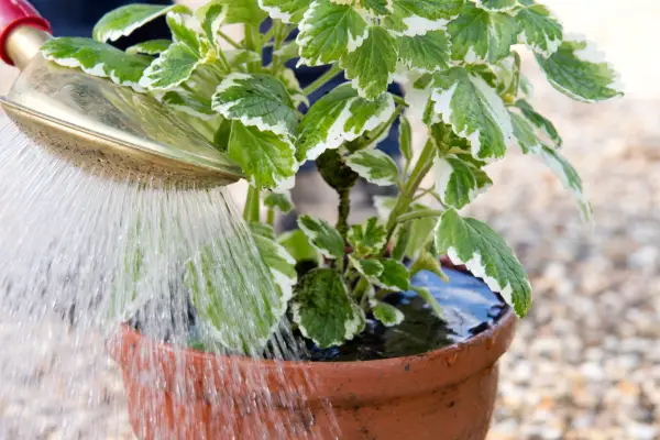 Bruser jorden på et potte geranium med en rose-head vanding kan